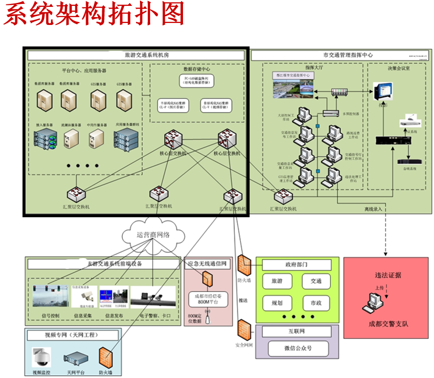 我司与某市区公安局交警大队集成商紧密合作,提供了全套系统架构解决方案,并提供了中心机房的基础设施建设集成内容。